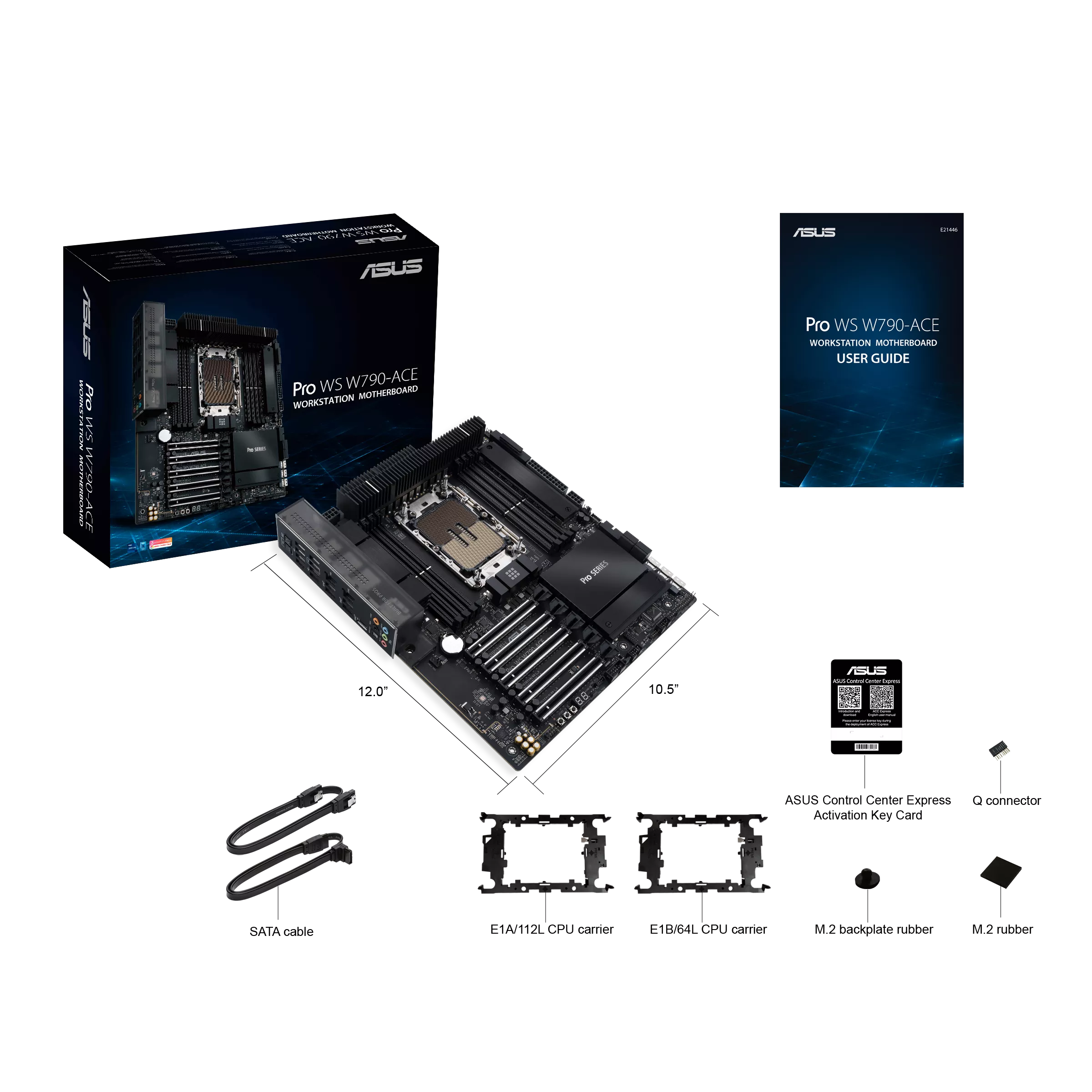 ASUS Pro WS W790-ACE is a high‑end CEB workstation motherboard built for Intel Xeon W‑3400/W‑2400 CPUs (LGA 4677). It supports up to 2TB DDR5 ECC R‑DIMM, 5×PCIe 5.0 x16 slots, 10G+2.5G LAN, server‑grade IPMI remote management, 12+1+1 power stages, dual M.2 PCIe 4.0, and robust thermal design for 24/7 stable operation in professional rendering, simulation, CAD, and content creation workloads.