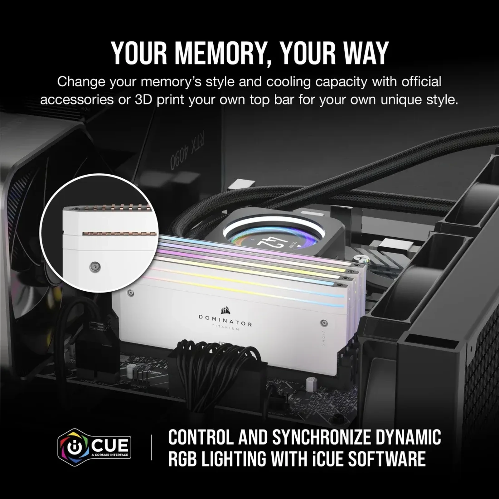 CORSAIR DOMINATOR TITANIUM RGB DDR5 Memory combines clean, refined styling with superior die-cast aluminum construction and advanced lighting design for a premium memory experience.