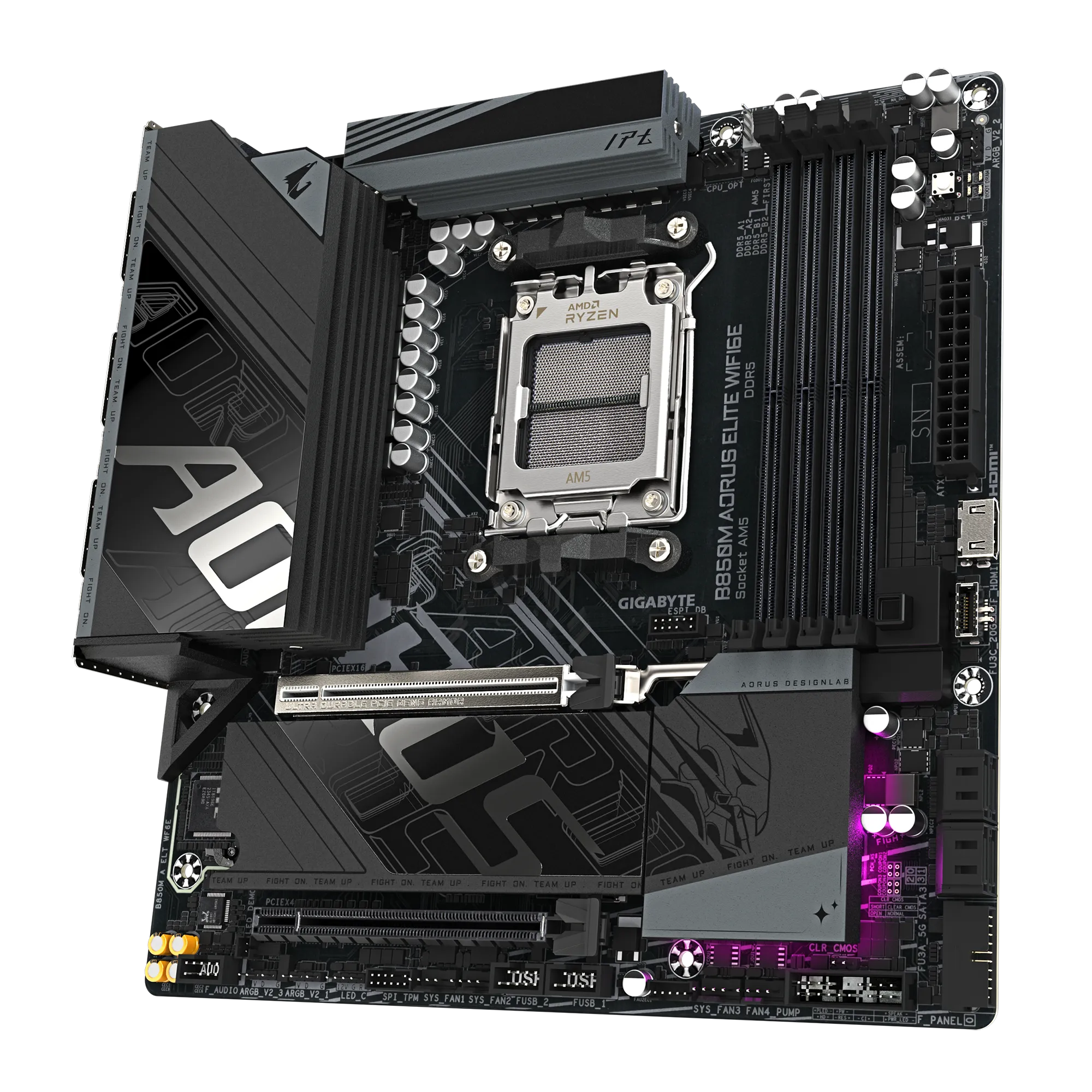 The B850M AORUS ELITE WIFI6E comes with RGB Fusion 2.0, allowing full customization of lighting effects with multiple zones and sync options across AORUS devices. Whether you want subtle ambient lighting or vibrant gaming aesthetics, the motherboard supports addressable LEDs and a wide array of patterns, enhancing the overall look of your gaming setup. The sleek black PCB and reinforced slots complement any build, giving your system a modern, aggressive look.