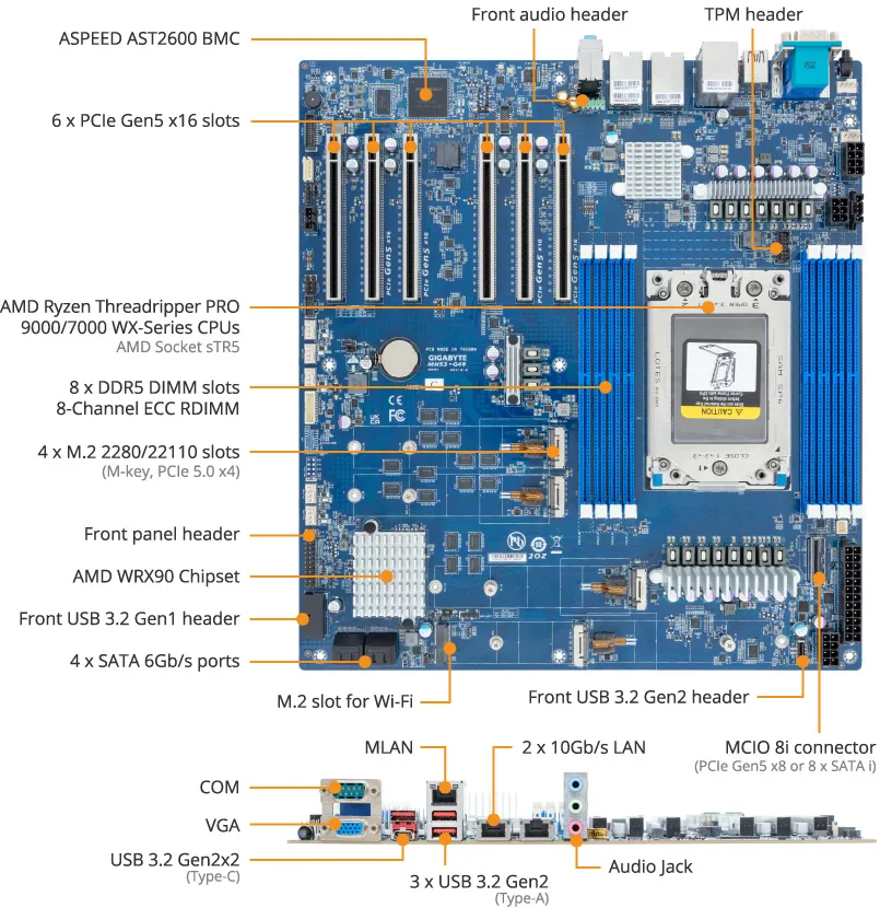 | Storage | 4 x PCIe Gen5 x4 M.2; 1 x MCIO 8i (PCIe Gen5 x8 or SATA); 4 x SATA 6Gb/s |