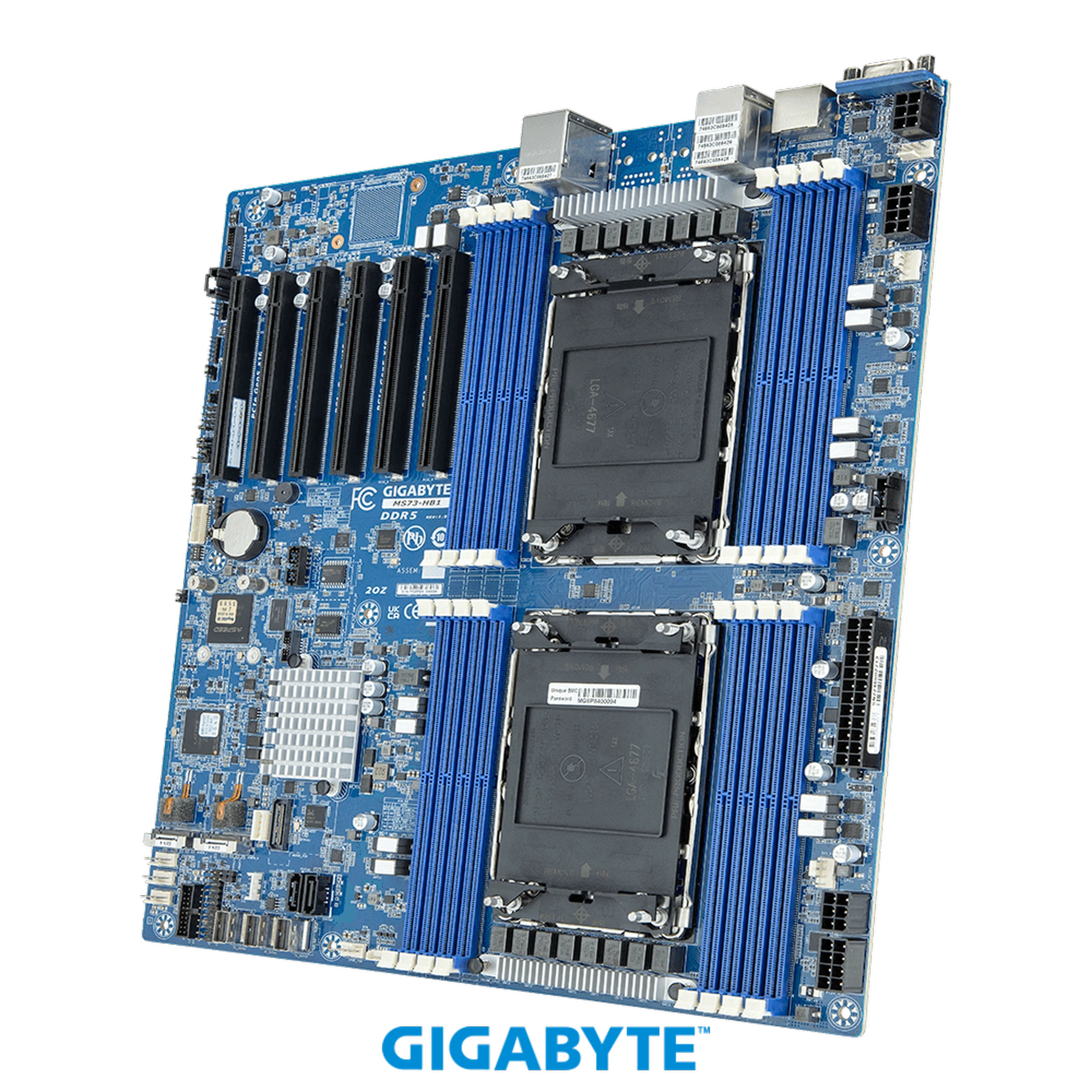 Gigabyte MS73-HB1 is a dual-socket E-ATX server motherboard supporting 4th/5th Gen Intel Xeon Scalable CPUs, DDR5 memory, PCIe Gen5, and advanced remote management.