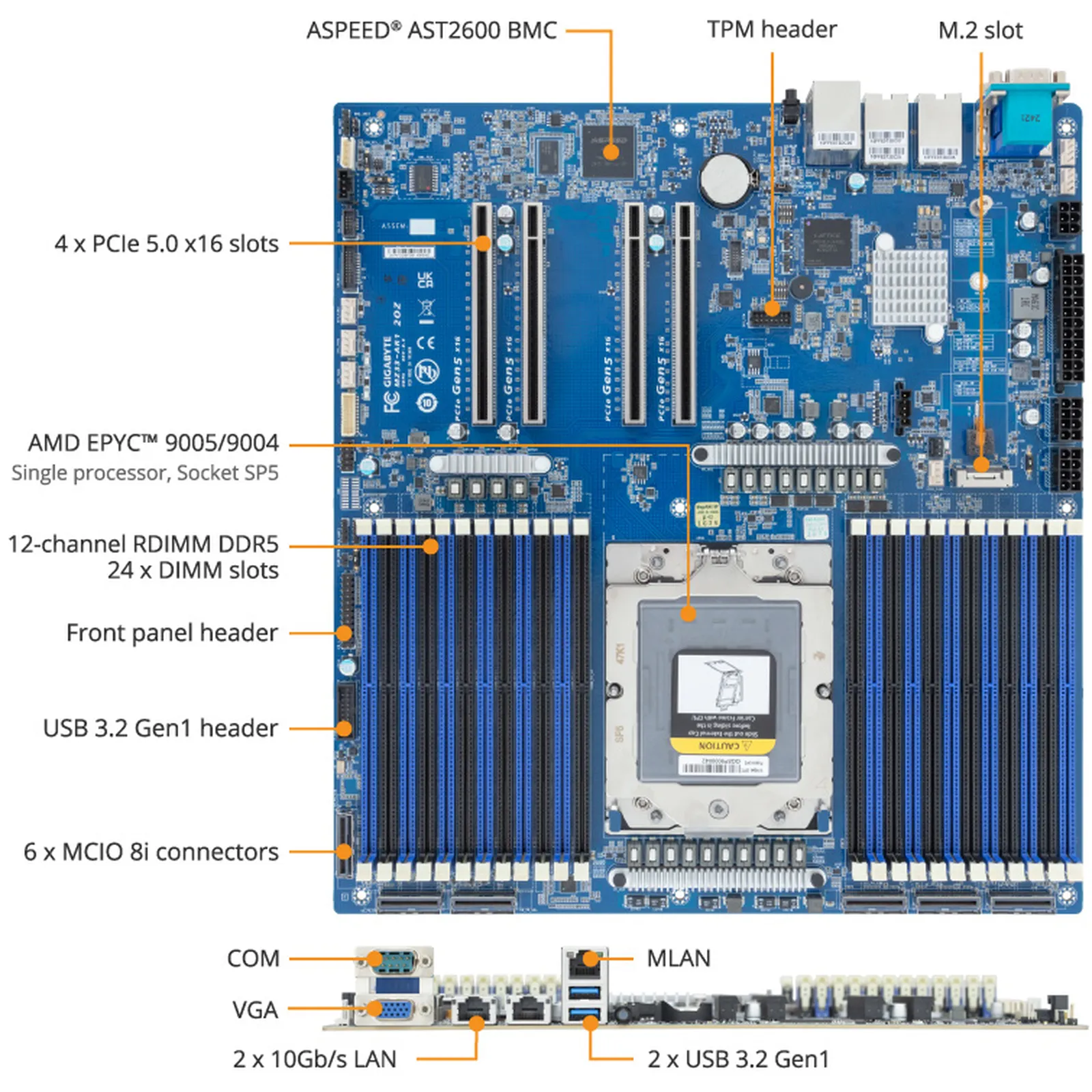 - 3 x MCIO connectors for Gen5 NVMe