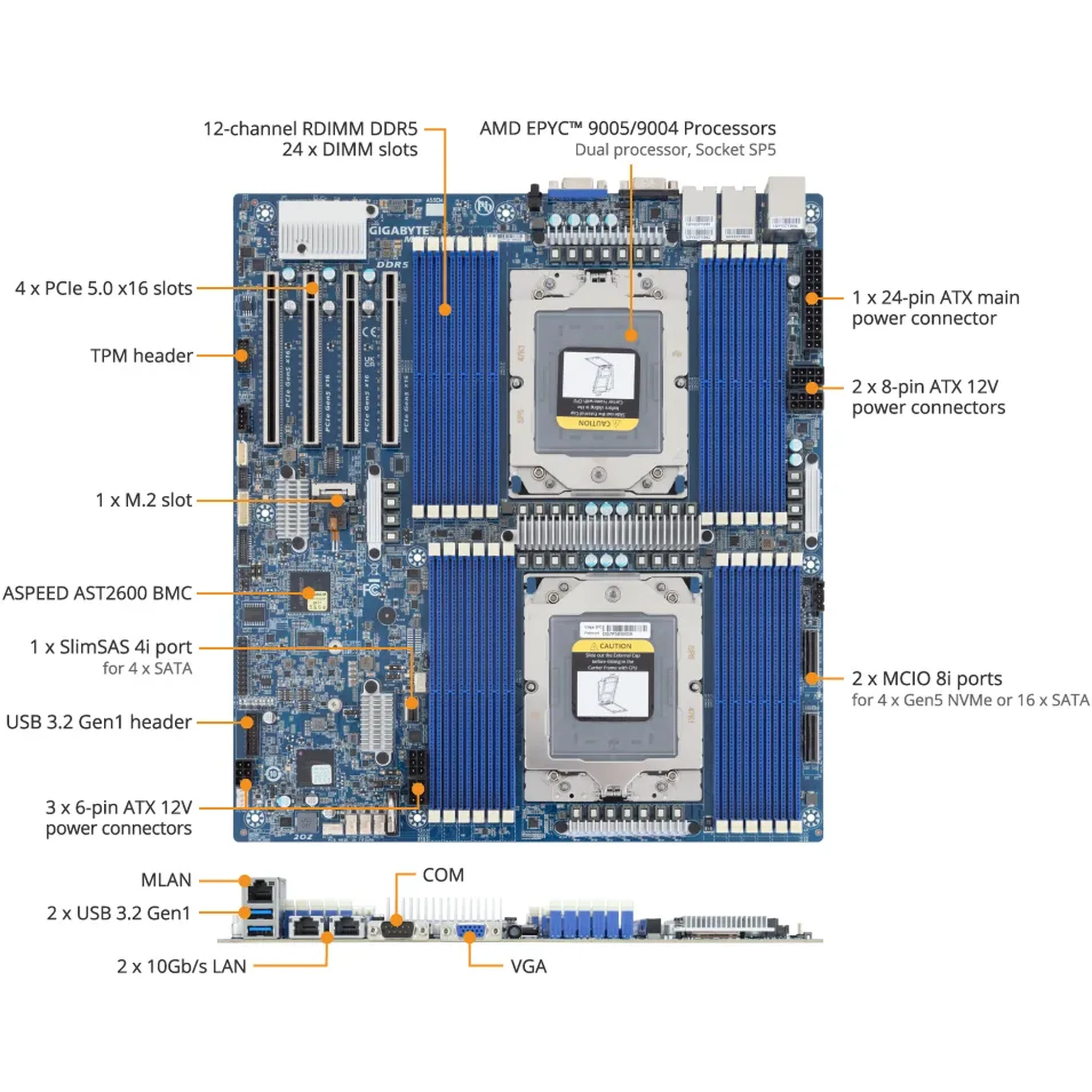 - 2 x MCIO 8i (PCIe Gen5 x8 or SATA)