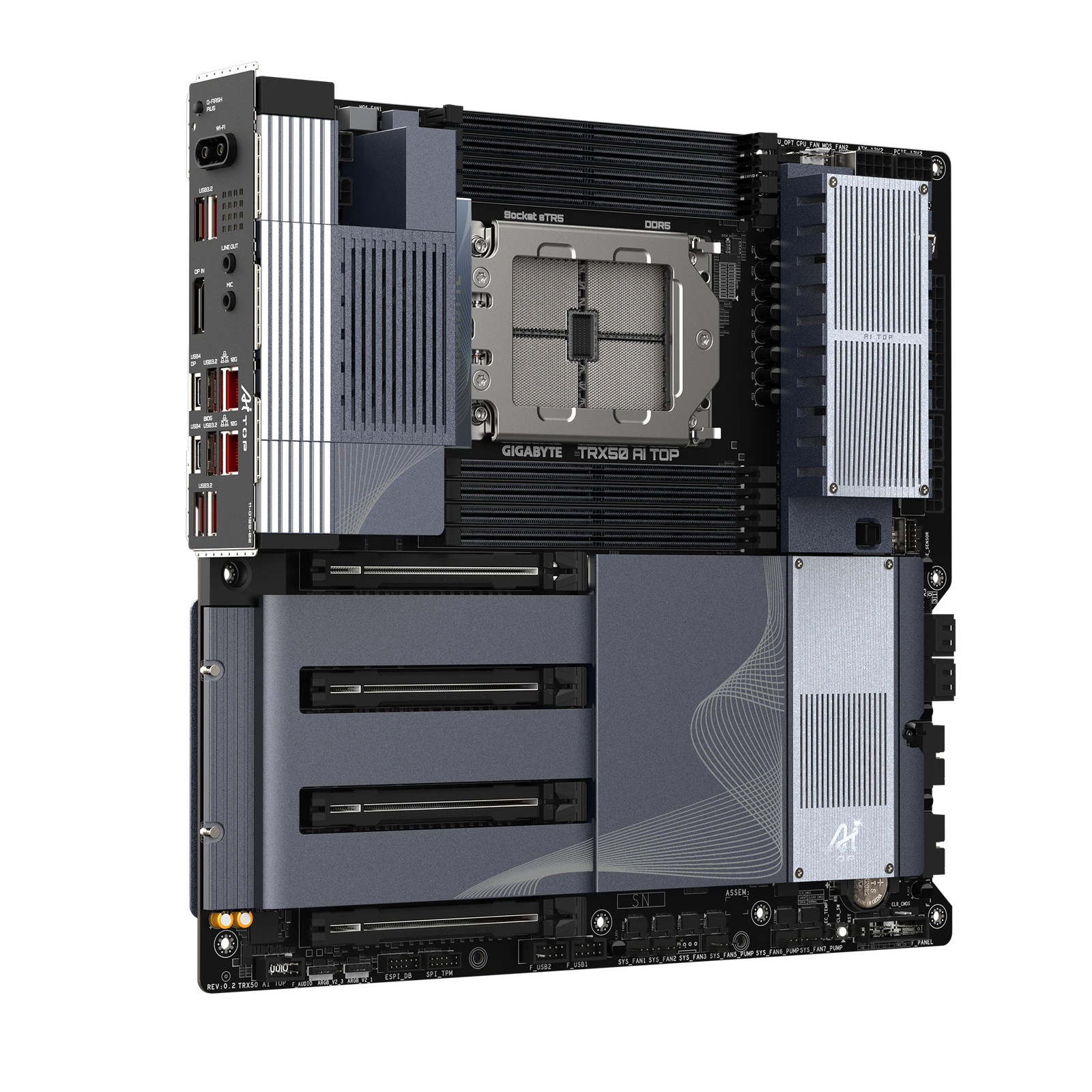 GIGABYTE TRX50 AI TOP is a flagship workstation motherboard with PCIe 5.0, 8-channel DDR5 ECC, WiFi 7, USB4, and dual 10Gb LAN for AI workloads.