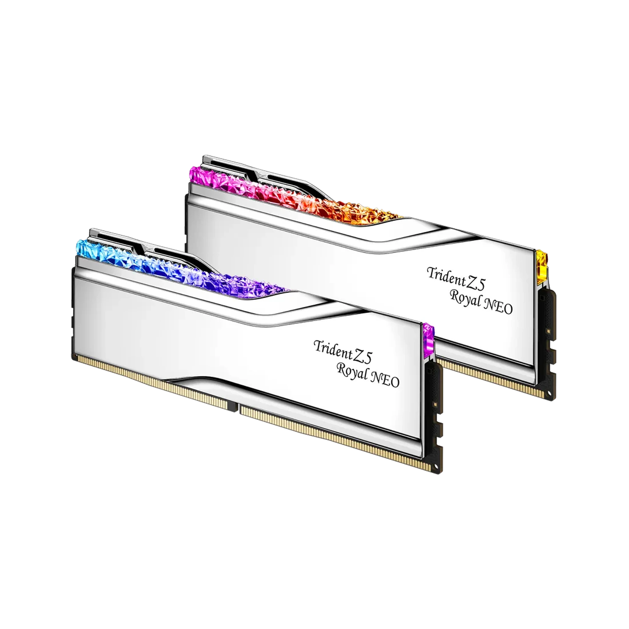 Trident Z5 Royal Neo is the luxury-class of extreme overclock performance DDR5 memory designed for AMD AM5 platforms, featuring a crown jewel design with a crystalline light bar for a magnificent display of customizable RGB lighting and electroplated aluminum heatspreaders with a mirrored finish in gold or silver colors.