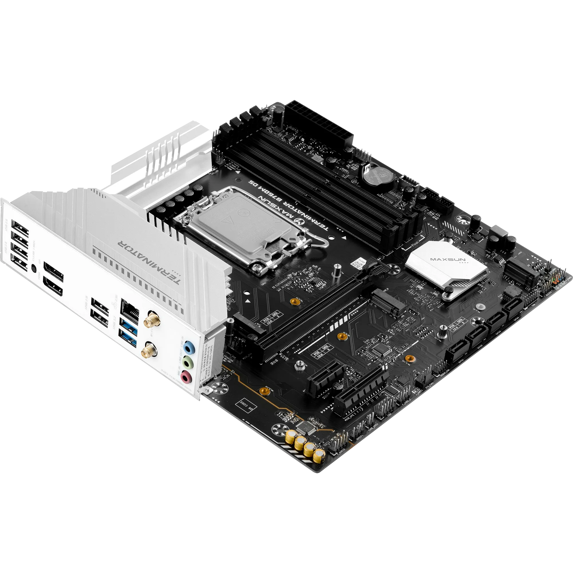 The MAXSUN MS-Terminator B760M D5 WIFI 6E is a Micro-ATX motherboard built on the Intel B760 chipset with support for Intel 12th, 13th, and 14th Gen processors. Featuring DDR5 memory, integrated WiFi 6E, high-speed M.2 NVMe storage, and PCIe expansion, it provides a reliable foundation for gaming, productivity, and modern PC builds.