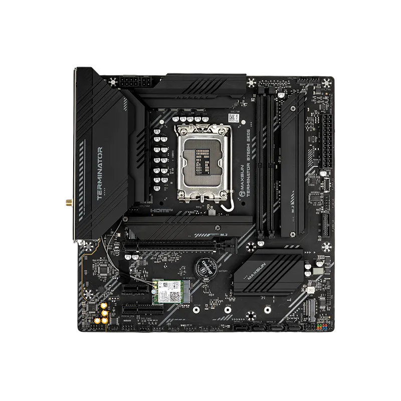 The MAXSUN MS-Terminator B760M GKD5 WIFI is a Micro-ATX motherboard built on the Intel B760 chipset with support for Intel 12th, 13th, and 14th Gen processors. Featuring DDR5 memory, integrated WiFi networking, high-speed M.2 NVMe storage, and PCIe expansion, it provides a powerful foundation for gaming and productivity PC builds.