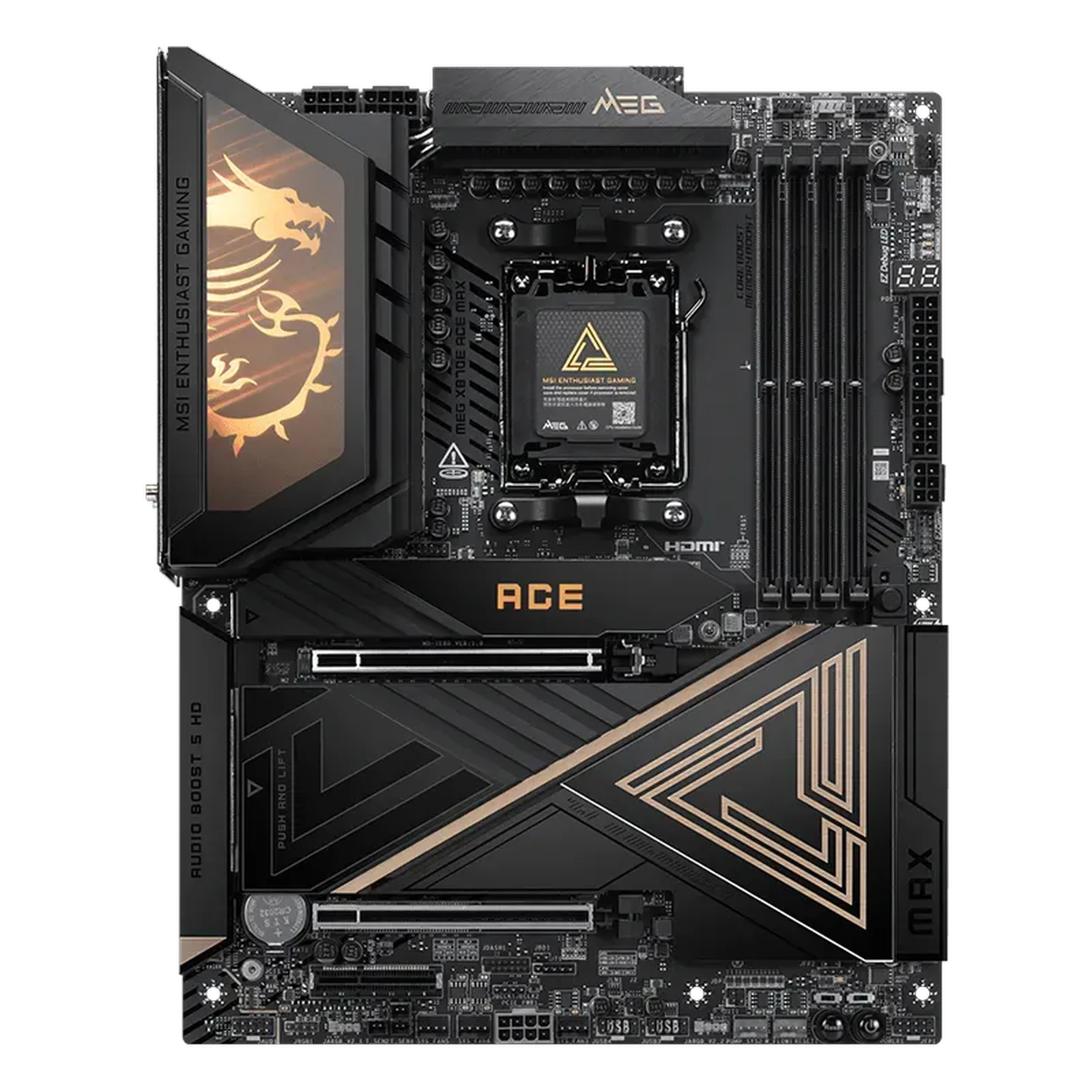 The MSI MEG X870E ACE MAX is a flagship ATX motherboard built for extreme performance. Featuring AMD X870E chipset, DDR5 up to 9000+ MT/s, PCIe 5.0, Wi-Fi 7, dual LAN (10G + 5G), USB4, and an advanced 18+2+1 power design, it is ideal for high-end gaming, AI computing, and professional workloads.
