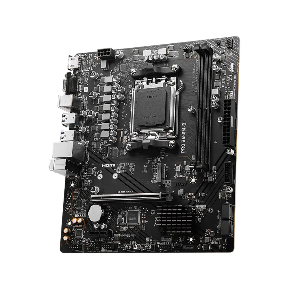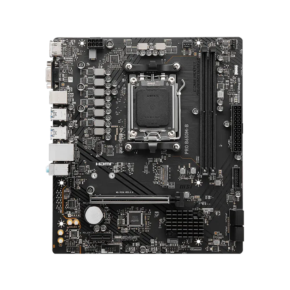 The MSI PRO B650M-B motherboard is designed to provide a stable, efficient, and future-ready platform for modern desktop computers. Built on the AMD B650 chipset, this motherboard supports the latest AMD Ryzen 7000 Series processors, bringing next-generation computing performance to home users, professionals, and PC enthusiasts.